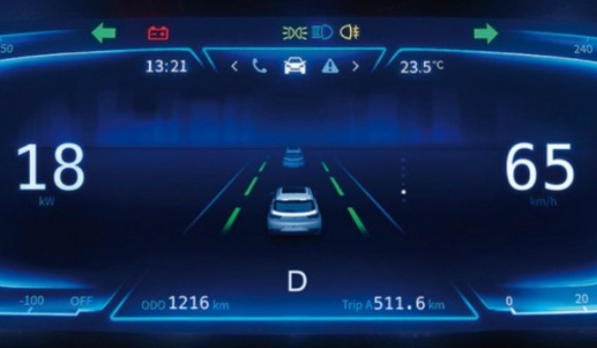 Tampilan ini menyajikan berbagai informasi penting seputar kendaraan, seperti kecepatan, sisa daya baterai, hingga indikator navigasi.