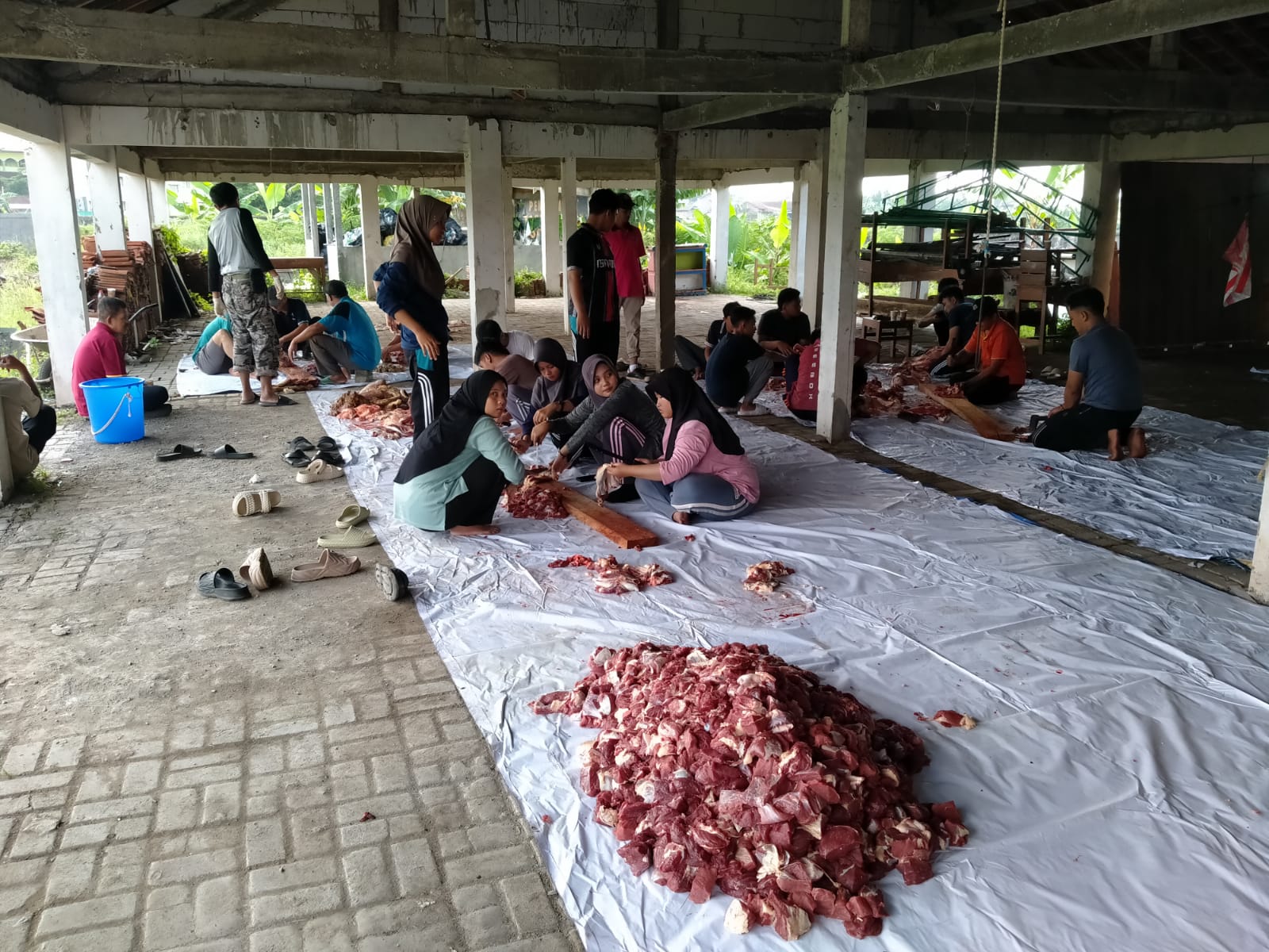 Siswi MAN 2 Banyumas yang tergabung dalam Rohis terlibat langsung dalam pemotongan daging sebelum dibagikan kepada warga sekitar madrasah.-YUDHA IMAN/RADARMAS-