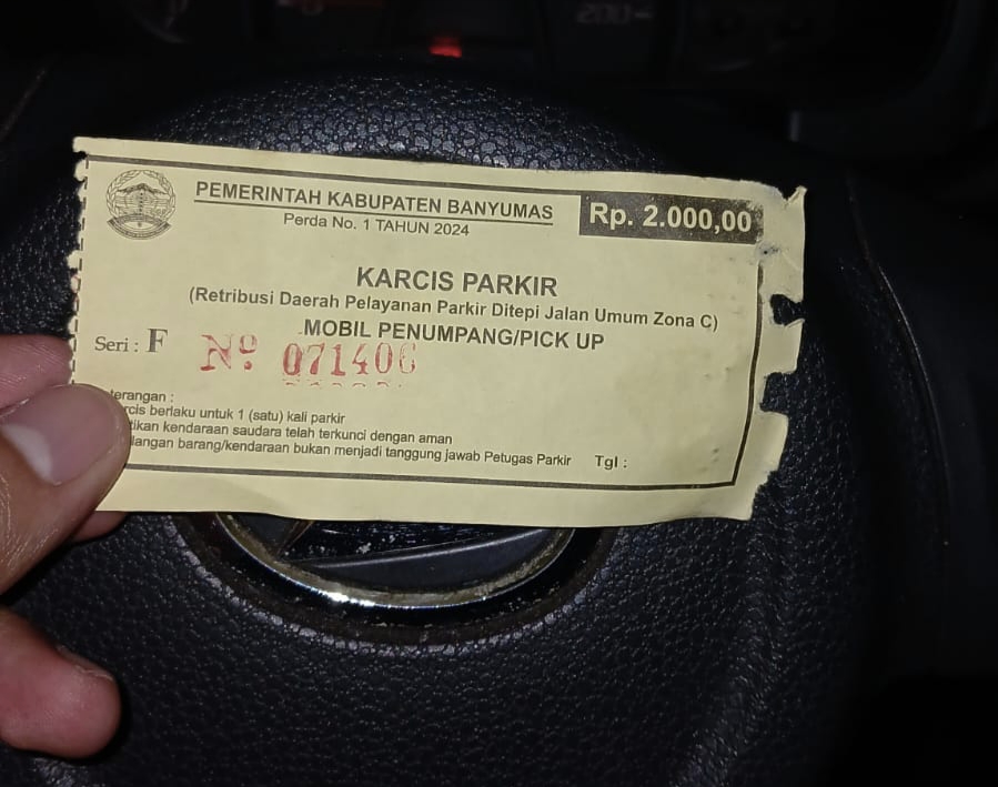 Fadhil menjelaskan karcis retribusi parkir tepi jalan umum yang resmi dikeluarkan oleh Badan Keuangan dan Aset Daerah (BKAD) Banyumas dengan nomor register bertinta merah dan dilengkapi titik-titik berlobang porporasi.