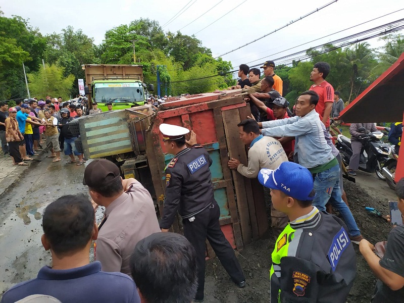 "Tiba-tiba bunyi brak. Ternyata truk terguling," terangnya. Seketika muatan pasir tumpah menutup jalan, sekaligus bodi truk tersebut.